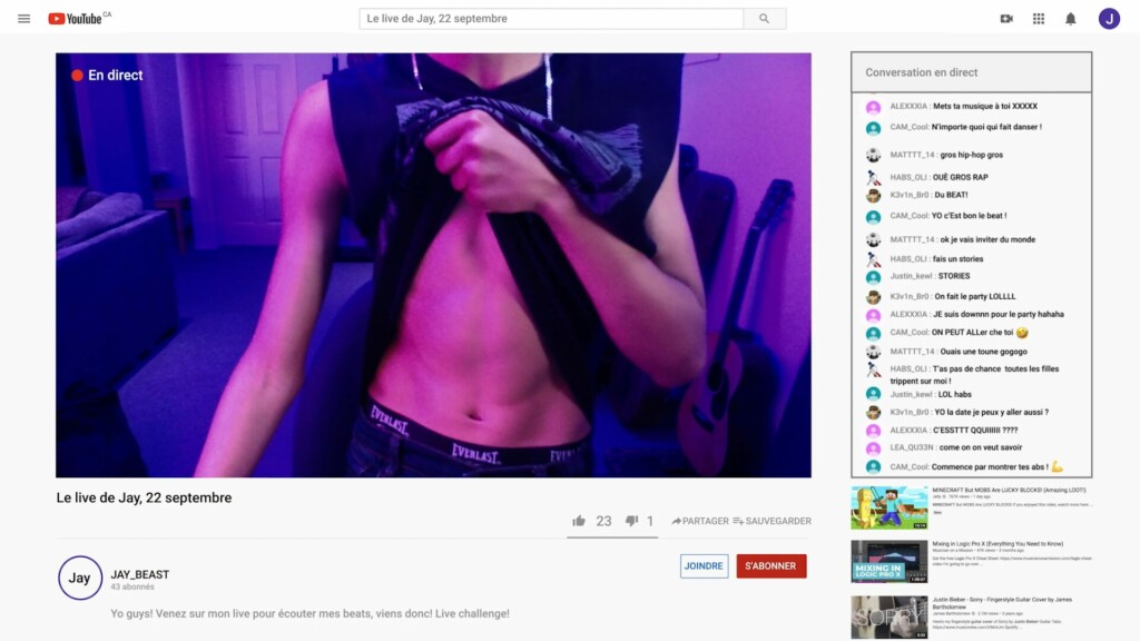 Jay débute une vidéo en direct et invite ses auditeurs et auditrices à rejoindre la vidéo. En même temps, il se filme et publie sa vidéo sur un autre réseau social pour attirer plus d’auditeurs et auditrices. Il propose de réaliser des défis en fonction des likes reçus: jouer l’une de ses compositions à 30 likes, dévoiler son crush (50 likes), sortir avec son crush (75 likes), enlever son chandail (100 likes), etc. Une personne lui demande de montrer ses abdominaux, ce qu’il fait. Il invite ses auditeurs et auditrices à lui donner de nouveaux défis pour plus de likes en disant que « rien ne va l’arrêter ».