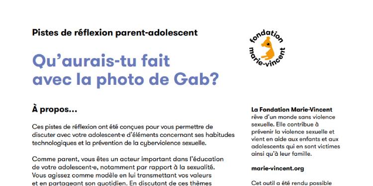 Fiche Qu’aurais-tu fait avec la photo de Gab? Ces pistes de discussion ont été conçues pour vous permettre de discuter avec votre adolescent·e de la vidéo Qu’aurais-tu fait avec la photo de Gab ?, d’éléments concernant ses habitudes technologiques ainsi que de prévention de la cyberviolence sexuelle. Elles s’adressent principalement aux jeunes de secondaire 2.